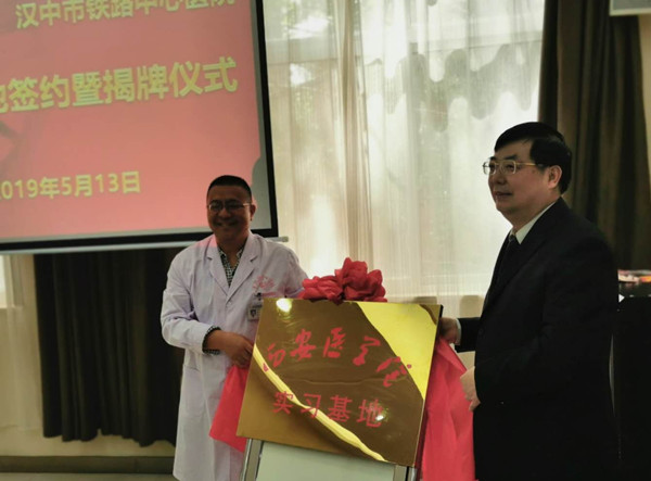 西安医学院党委书记范兵、汉中市铁路中心医院院长李家骏共同为实习基地揭牌