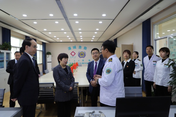 考察组实地对蒲城县医院急救中心、胸痛中心、介入中心、心电网络中心、影像中心、重症医学科、教学以及实训中心进行了考察。