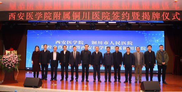 首先,医院党委书记刘万卿介绍了参会的领导和嘉宾,其次,由西安医学院实践教学处李斌副处长宣读教学基地文件。在与会领导及参会同仁的共同见证下,杨帆校长与胡贵仲院长代表校院双方签订合作教学协议,杨帆校长和李荣副市长共同为“西安医学院附属铜川医院”揭牌。