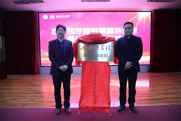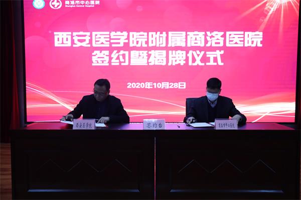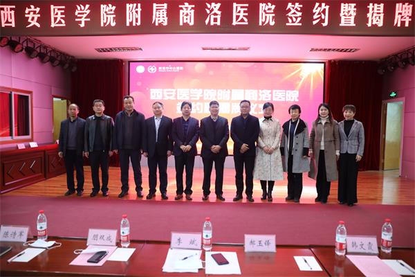 陈诗军副院长首先介绍了参加签约暨揭牌仪式的各位领导和嘉宾,接下来在全体参会同仁的共同见证下,西安医学院李斌副处长与商洛市中心医院朋双成院长代表校院双方签订合作协议,李斌副处长与商洛市卫健委郝玉锋副主任共同为“西安医学院附属商洛医院”揭牌。